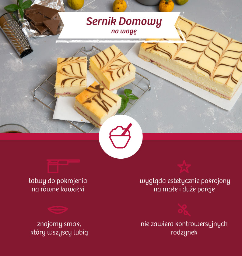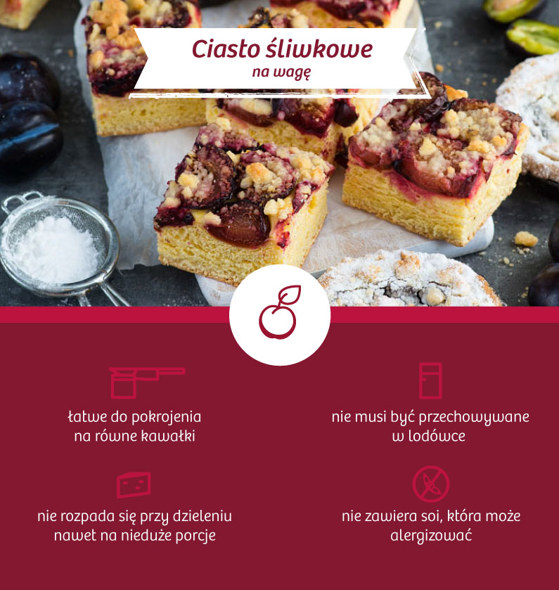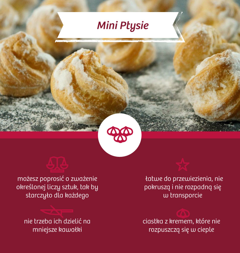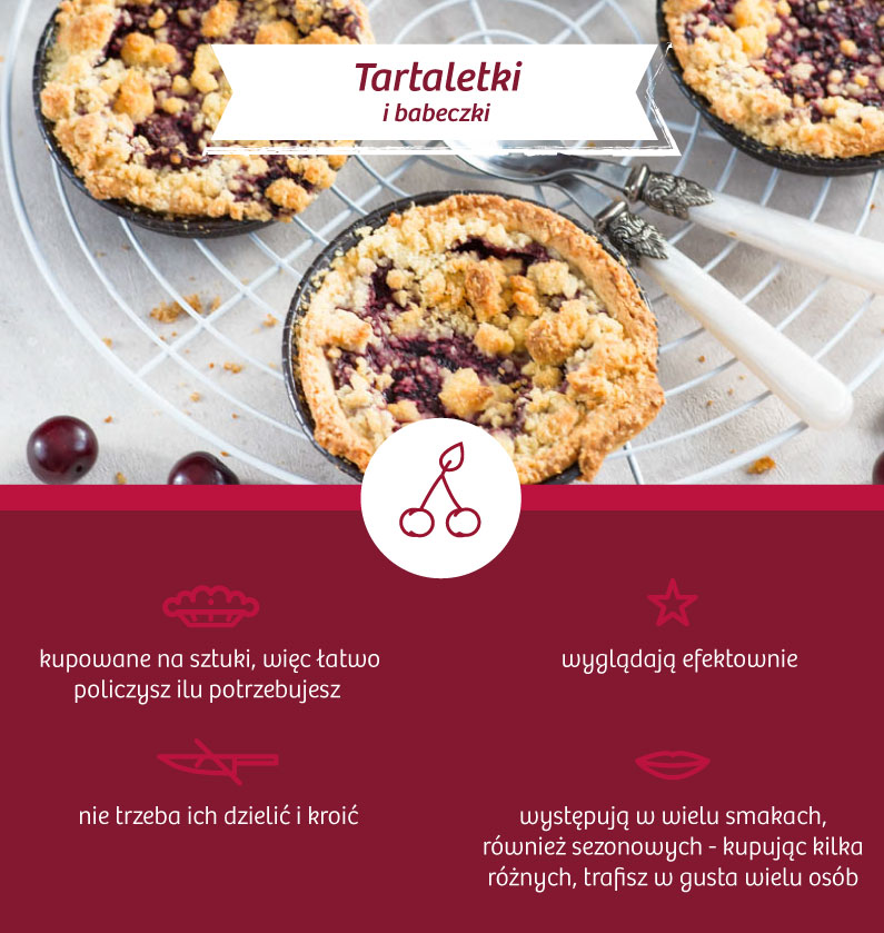 Jeśli możesz mieć problemy z pokrojeniem ciasta w pracy, np. nie ma na to wystarczająco dużo miejsca w pokoju socjalnym lub po prostu nie masz na to czasu, przemyśl zakup Babeczek (malinowych, leśnych, orzechowych, porzeczkowych) lub tartaletek (ze śliwką, z wiśniami oraz sezonowo także z rabarbarem) na sztuki. Możesz też wziąć pod uwagę zakup Kruchych Rogalików lub Mini Ptysi na wagę.