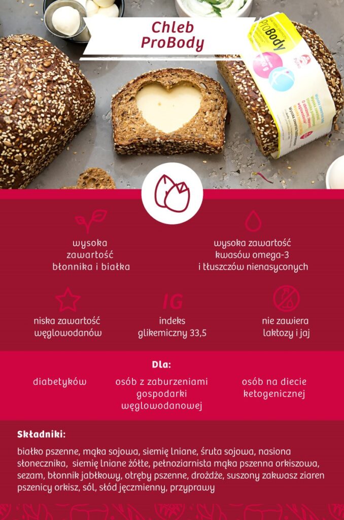Idealnie wpisuje się także w dietę osób z zaburzeniami lipidowymi. Dieta z kontrolowaną zawartością kwasów tłuszczowych wymaga ograniczenia spożycia nasyconych kwasów tłuszczowych i częściowe ich zastąpienie nienasyconymi kwasami tłuszczowymi, których cennym źródłem – dzięki zawartości siemienia lnianego, nasion słonecznika i sezamu – jest właśnie chleb ProBody. Dostarcza on także sporą ilość błonnika, który w diecie osób z hiperlipidemią, miażdżycą czy też diecie dla profilaktyki choroby niedokrwiennej serca odgrywa szczególnie ważną rolę.