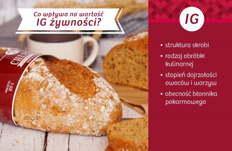 Na przykład: chleb z mąki pełnoziarnistej ma niższe IG, a z jasnej oczyszczonej wyższe.