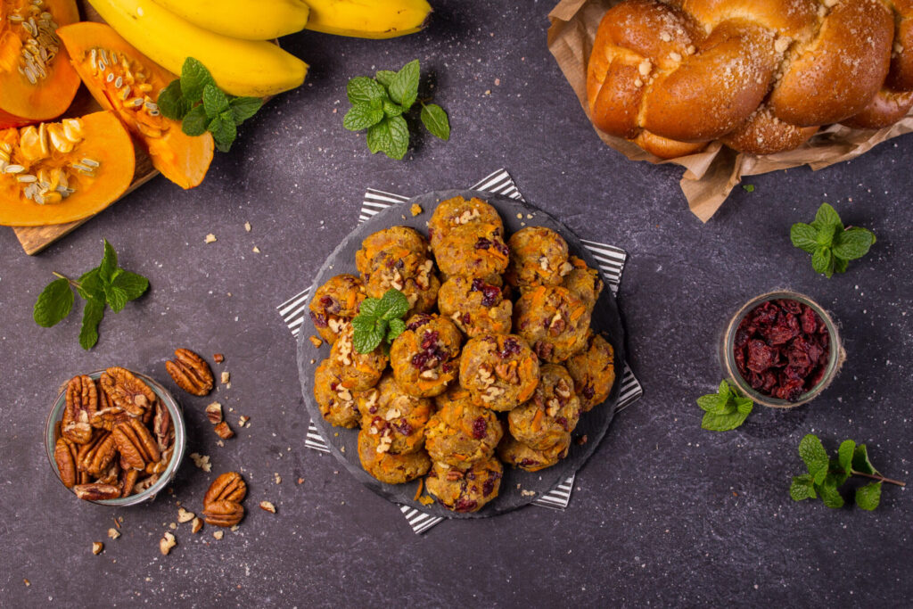 Chałkę miksujemy, dynię ścieramy na tarce o średnich oczkach. Jajko blendujemy z bananem oraz masłem orzechowym. Dodajemy proszek do pieczenia, cukier, szczyptę soli, roztopione masło, chałkę, dynię, żurawinę i orzechy. Dokładnie mieszamy.
