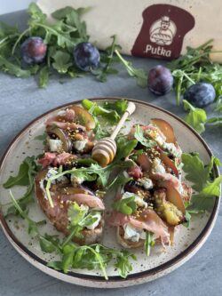 Posmaruj każdą kromkę obficie serkiem kanapkowym, ułóż rukolę, śliwki i szynkę parmeńską. Posyp pokruszonym serem pleśniowym gorgonzola i polej całość miodem. Serwuj posypane pyłkiem pszczelim.