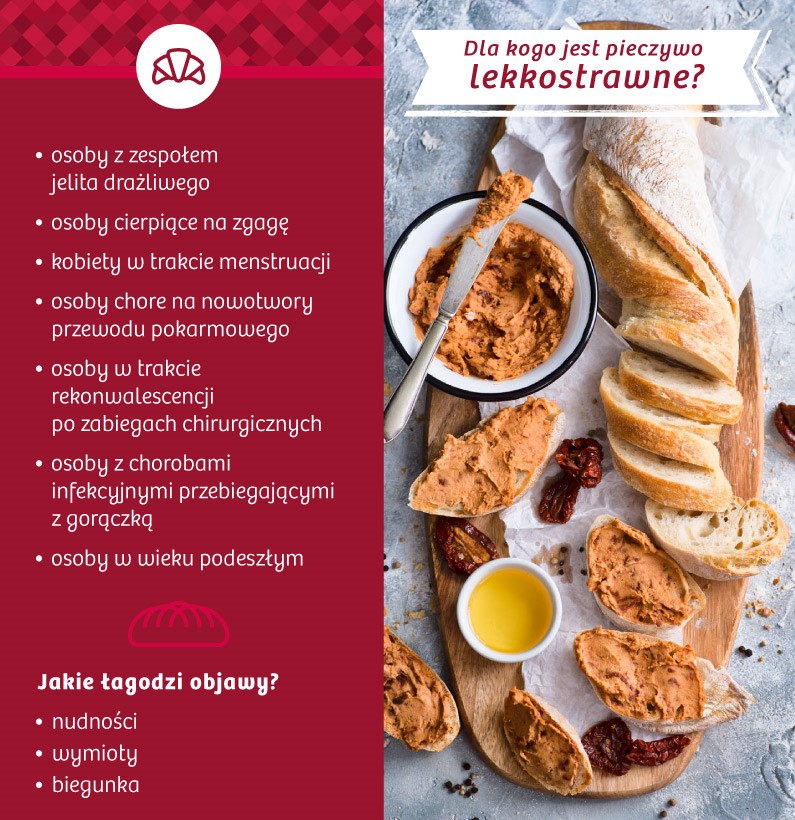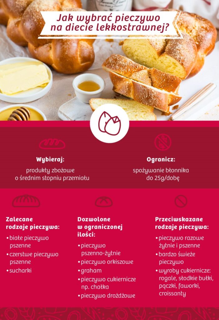 Komponując samodzielnie dietę łatwo przyswajalną dla organizmu, warto w pierwszej kolejności pamiętać, że najbardziej polecane jest pieczywo czerstwe. Świeże pieczywo jest gorzej trawione, czopuje światło jelit, a poza tym ulega fermentacji, wzmagając przykre dolegliwości ze strony układu pokarmowego.