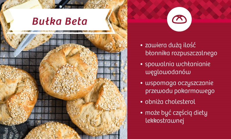 Dobrym pomysłem jest też Bułka Beta, która spożywana raz na jakiś czas może stanowić urozmaicenie diety lekkostrawnej. W jej skład wchodzi mąka pszenna, woda, ziarna owsa (5%), skondensowana mąka owsiana z otoczki ziarna owsa (5%), płatki owsa (2%), drożdże oraz sól. Bułka Beta posiada wysoką zawartość błonnika rozpuszczalnego w wodzie. Istnieją dwa rodzaje błonnika – rozpuszczalny i nierozpuszczalny. Choć oba spełniają ważne role w prawidłowym funkcjonowaniu organizmu, w przypadku diety lekkostrawnej rekomendowany jest wyłącznie błonnik rozpuszczalny. Wspomaga on oczyszczanie przewodu pokarmowego, obniża poziom cholesterolu oraz trójglicerydów. Jest też pożywką dla dobroczynnych bakterii w jelitach. Dzięki niemu Bułka Beta, mimo zawartych ziaren owsa i skondensowanej mąki owsianej, nadal jest lekkostrawna. Za sprawą owsa posiada beta-glukany, które obniżają cholesterol, a także indeks glikemiczny, co zapobiega nagłemu skokowi insuliny we krwi. Mogą ją więc spożywać nie tylko osoby, które mają problemy z trawieniem, ale także te z wahaniami poziomu cukru w organizmie.