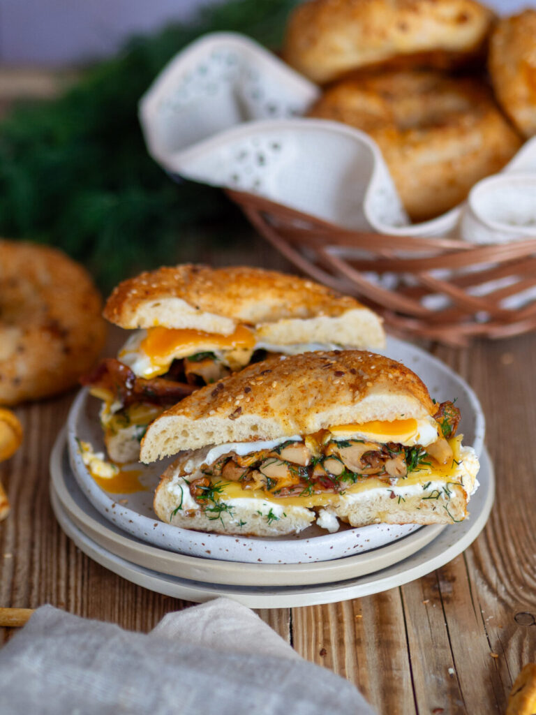 Zachęcamy też, by spróbować jesiennej odsłony bajgli z serem cheddar i kurkami. Intensywne smaki tej kanapki są doskonałym pomysłem na rozpoczęcie dnia lub pyszną kolację dla dwojga. Bajgle z grzybami są również bardzo sycące. Oprócz sera dodajemy do nich także boczek i jajka.