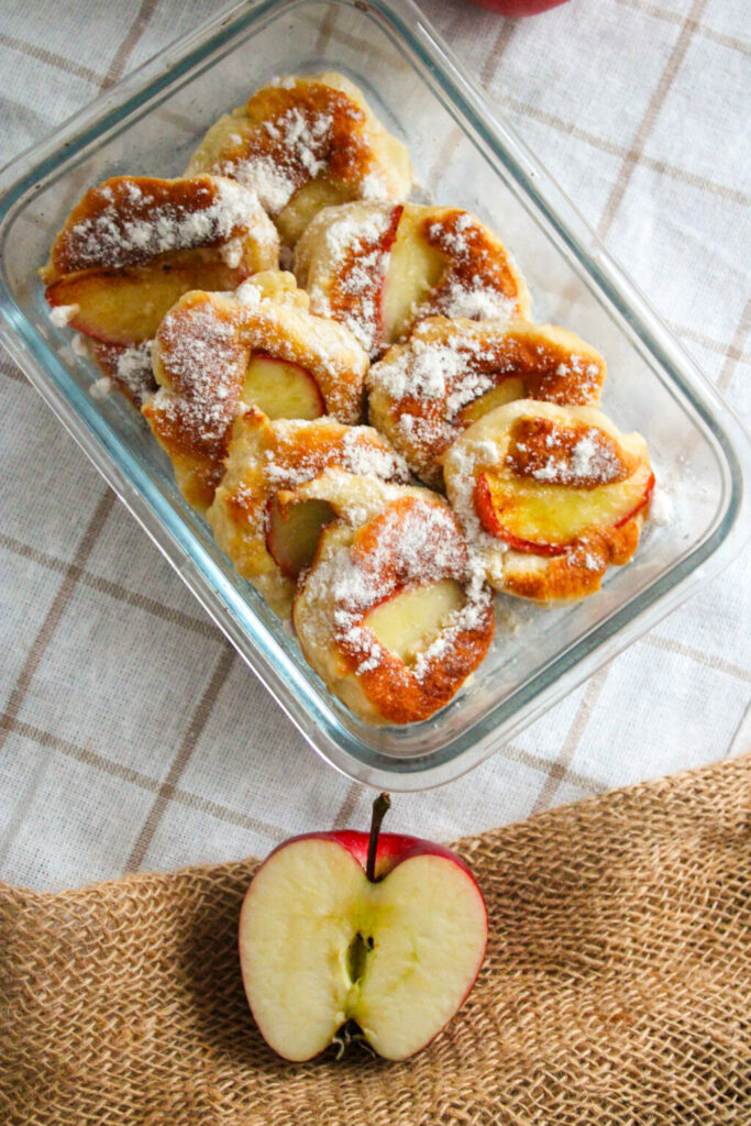 Mini Jabłecznik Orkiszowy – to kruche ciasto z mąki orkiszowej w towarzystwie jabłek i cynamonu, słodzone ksylitolem – substancją wyróżniającą się obniżoną kalorycznością i niskim indeksem glikemicznym. Za niższy indeks glikemiczny ciastka odpowiada także przewaga mąki orkiszowej nad pszenną tradycyjną. Taka proporcja dodatkowo sprawia, że deser posiada wyższe walory odżywcze. Orkisz jest źródłem błonnika pokarmowego, cynku, żelaza, potasu, magnezu i licznych witamin z grupy B. Bioaktywne związki zawarte w ziarnie orkiszu mają działanie obniżające stężenie cholesterolu i glukozy we krwi. Wyroby orkiszowe cechują się też wyższym indeksem sytości, a to oznacza, że po ich spożyciu przez dłuższy czas opuści Cię ochota na małe co nieco.