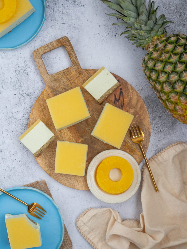 Skyrnik – idealny dla wielbicieli serników, zbierający w recenzjach same „ochy i achy”! To delikatny sernik na spodzie z mąki migdałowej i lnianej, z ananasową żelką, słodzony erytrytolem i ksylitolem. Już sam spód tego ciacha to bomba wartości odżywczych. Połączenie w nim mąki migdałowej i lnianej sprawia, że wyrób cechuje się małą zawartością węglowodanów na korzyść tłuszczów pochodzenia roślinnego. Super wpisuje się w grupę niżejwęglowodanowych i wyżejbiałkowych deserów! Jest w nim jeszcze jeden wyjątkowy składnik. Herbata matcha o wysokiej zawartości chlorofilu – zielonego barwnika, który jest jednym z najsilniejszych przeciwutleniaczy w żywności.