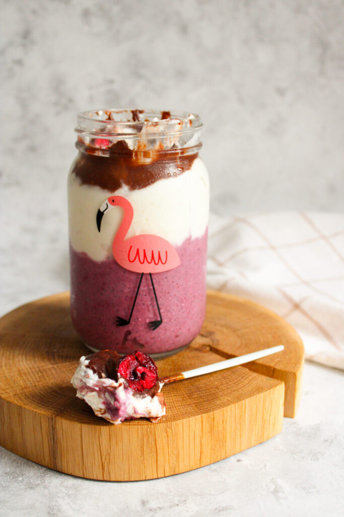 Następnego dnia wyłożyć do słoiczków, na to położyć warstwę Skyra wymieszanego z wanilią i polać rozpuszczoną w kąpieli wodnej czekoladą. Posypać liofilizowanymi owocami i włożyć jeszcze na chwilę do lodówki.