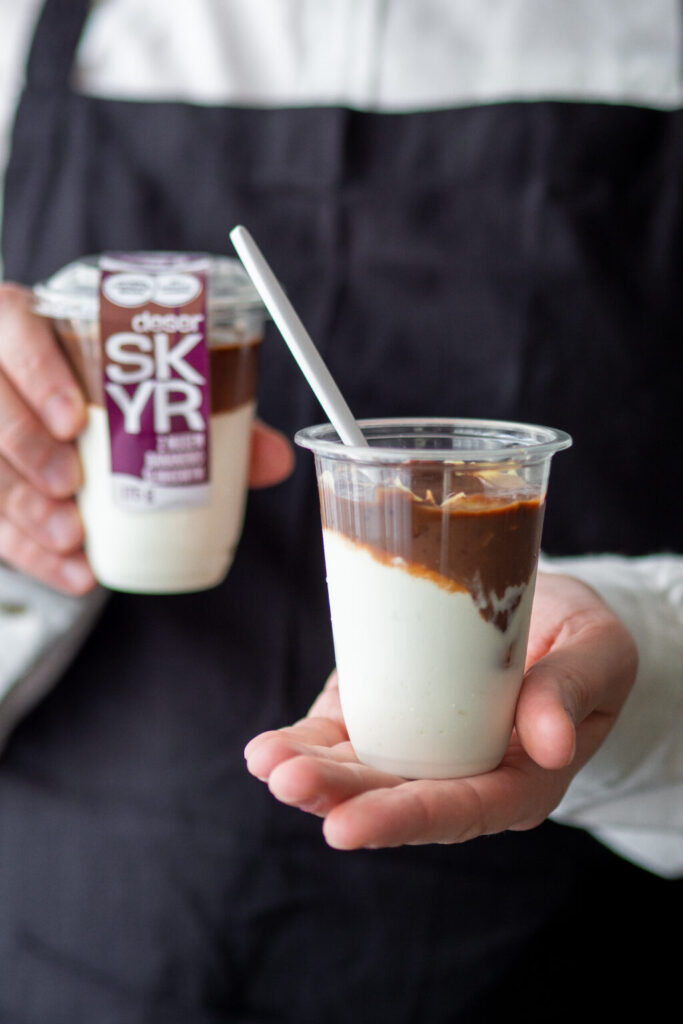 Skyr z musem bananowo-śliwkowym – zadbaliśmy, aby deser oprócz węglowodanów zawierał dobre źródło białka i zdrowe tłuszcze. Jogurt typu islandzkiego Skyr, migdały oraz naturalne kakao gwarantują zbilansowany skład, który docenią osoby dbające o linię czy z chorobami gospodarki węglowodanowej. Słodki smak deseru uzyskaliśmy poprzez dodanie banana i suszonych śliwek zawierających w sobie naturalne cukry w postaci fruktozy. My jesteśmy na tak, a Ty?