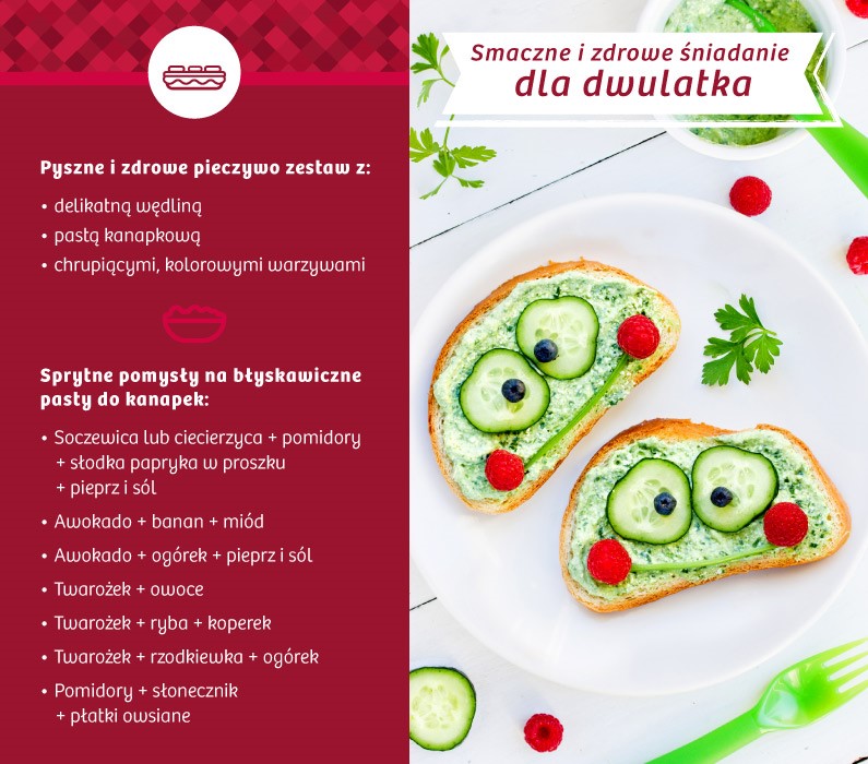 Świeże, chrupiące pieczywo i pyszna pasta czasem mogą nie wystarczyć, gdy maluch odmawia nawet spróbowania nowej potrawy. Jak go zachęcić? Jeśli masz zapas cierpliwości i zdolności plastycznych, możesz wyczarować dziecku kanapki-zwierzątka, np. wycinając kromki w odpowiednie kształty. Innym, niezłym sposobem jest przygotowanie kanapek pełnych najróżniejszych barw. Liście sałaty, pomidorki koktajlowe, cienkie paseczki papryki czy plasterki rzodkiewki sprawią, że śniadanie dwulatka będzie nie tylko zdrowe, ale też kolorowe i zachęcające.