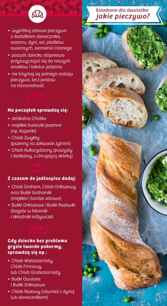 Dla niemowlaków dopiero rozpoczynających swoją przygodę ze stałymi pokarmami polecane jest przede wszystkim białe, pszenne pieczywo. Jest ono lekkostrawne i miękkie, dlatego maluch i jego układ pokarmowy z łatwością sobie z nim poradzą. Dwulatkom jednak spokojnie można już podawać pieczywo razowe czy z ziarnami. Warto to robić, by przyzwyczajać malca do różnorodności na talerzu. Dwulatkom jednak można już podawać pieczywo pszenno-żytnie, razowe czy z ziarnami.