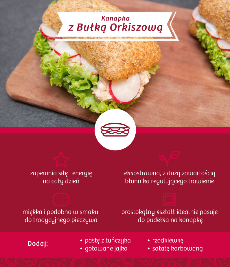 pastą z tuńczyka – pasty na kanapki są wilgotne, dzięki czemu kanapki nie schną tak szybko. Do bułki orkiszowej polecamy szczególnie pastę z tuńczyka z puszki i domowego majonezu. Tuńczyk jest lekkostrawną rybą z wysoką zawartością białka, nienasyconych kwasów tłuszczowych, wapnia, żelaza, potasu i fosforu oraz witamin B3 i D3;