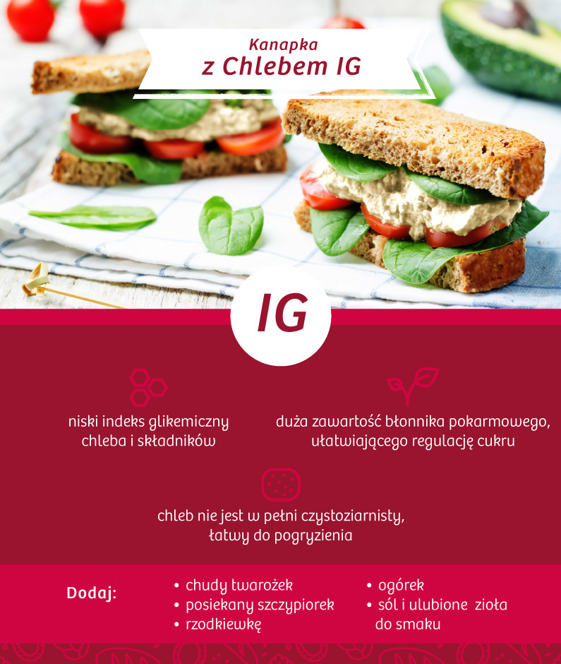 Cukrzyca jest chorobą cywilizacyjną, która dotyka coraz większą część naszego społeczeństwa. Szykując kanapkę dla diabetyka, trzeba wybrać pieczywo o niskim indeksie glikemicznym, takie jak Chleb IG (IG 46). Zawiera on sporo błonnika pokarmowego ułatwiającego trawienie i utrzymanie stałego poziomu cukru we krwi. Ma też niski wskaźnik WW i WBT.