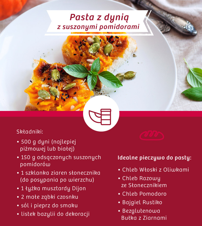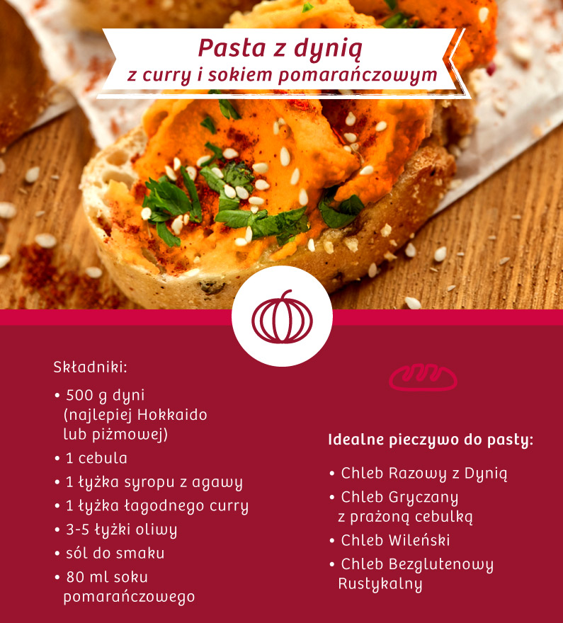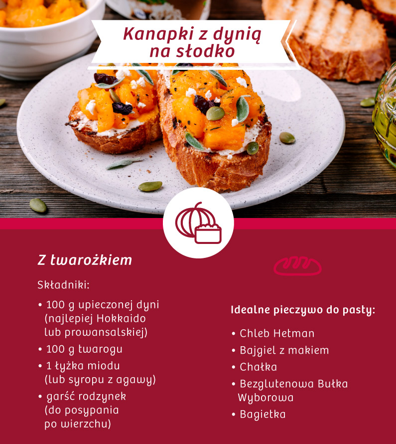 Jako bazę wybierz słodką Chałkę, Bajgiel z Makiem lub Chleb Hetman na bazie pumpernikla. W miseczce zblenduj ok. 100 g twarożku (może być tłusty lub półtłusty) razem ze 100 g upieczonej dyni, najlepiej odmiany Hokkaido, która ma lekko orzechowy posmak, 1 łyżką miodu lub syropu z agawy. Rozsmaruj pastę na chlebie. Możesz posypać kanapkę garścią rodzynek.