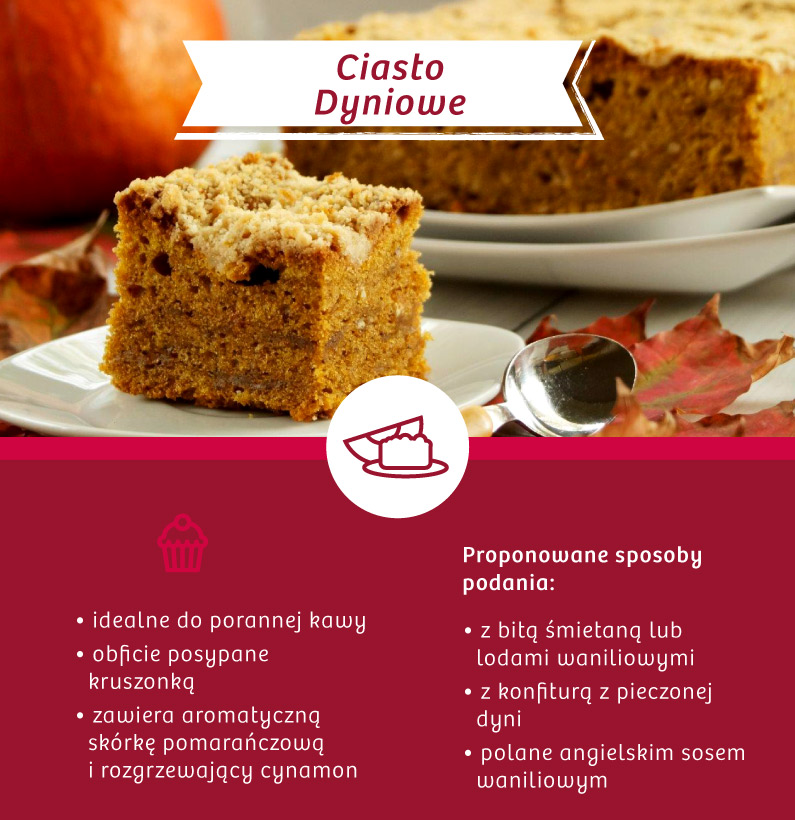 Dynia ma na tyle neutralny smak, że z powodzeniem można z niej przygotować słodkie śniadanie, przekąskę czy deser. Bardzo popularne jest korzenne, rozgrzewające ciasto dyniowe z dodatkiem skórki pomarańczy i cynamonu, które może być pysznym i pożywnym śniadaniem, przekąską do kawy lub dodatkiem do zimowej herbaty z pomarańczami i goździkami.