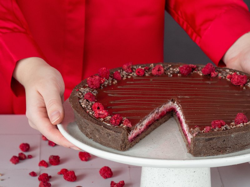 Bezcukrowa tarta z kremem twarogowo-śmietankowym z musem malinowym. Udekorowana czekoladą bez cukru, liofilizowaną maliną i ziarnem kakaowca.