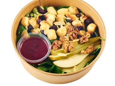 Sałatka na bazie miksu sałat z serem góralskim, gruszką, ogórkiem świeżym i dodatkiem suszonej żurawiny, orzechów włoskich i płatków migdałowych z sosem żurawinowym.