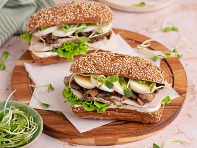 Kanapka ze schabem, jajkiem i pieczarkami, przygotowana w Bułce KETO.