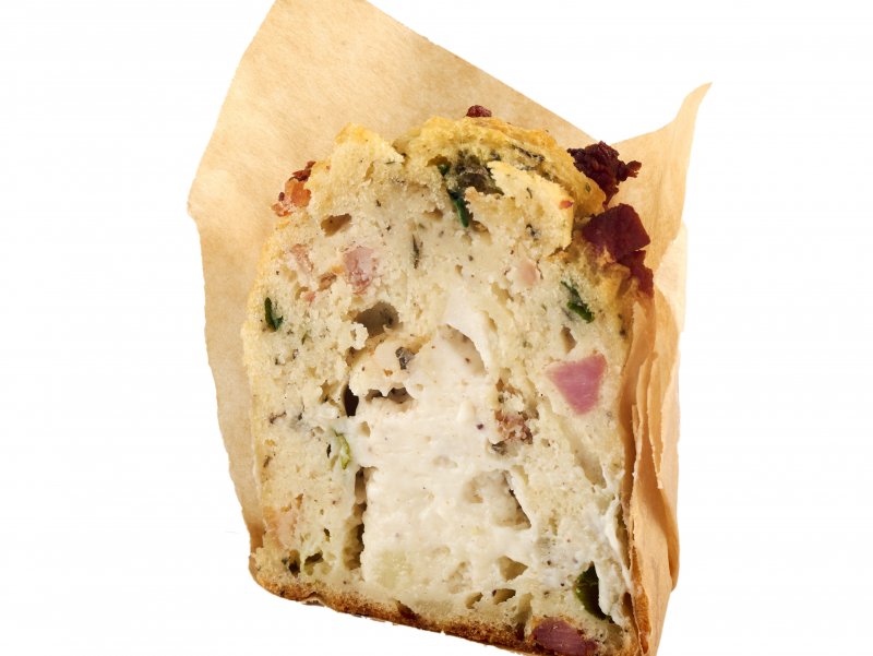 Wytrawny muffin z nadzieniem bechamelle, boczkiem i szczypiorkiem, ozdobiony prażonym boczkiem.