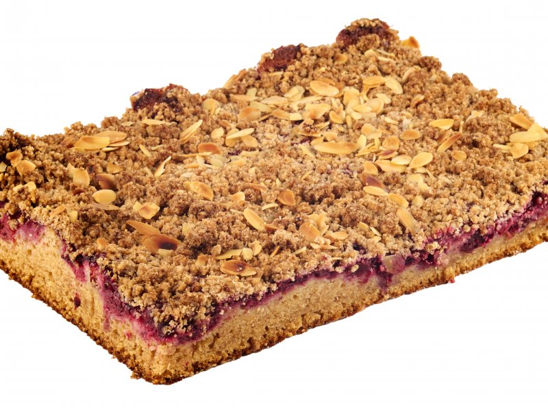 Ciasto na mące graham z wiśniami, posypane kruszonką, udekorowane prażonymi migdałami. Produkt BEZ CUKRU.