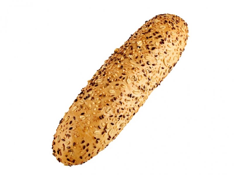 Paluch pszenny posypany siemieniem lnianym, nasionami sezamu oraz płatkami owsianymi.