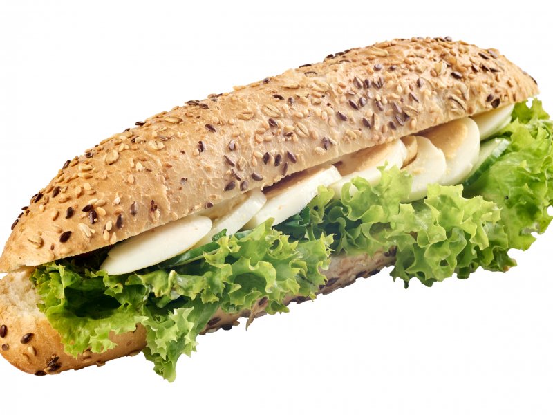 Składniki: paluch rustiko 56 % (mąka PSZENNA, woda, siemię lniane, olej rzepakowy, nasiona SEZAMU, płatki OWSIANE, cukier, drożdże, sól, mąka SOJOWA), JAJKO gotowane 22 %, majonez 11 % (woda, olej rzepakowy, skrobia modyfikowana kukurydziana, cukier, pasteryzowane żółtko JAJA, cukier, ocet spirytusowy, sól, przyprawy (zawiera GORCZYCĘ), ekstrakt drożdżowy, substancja zagęszczająca: E415, aromat, substancja konserwująca: E202), sałata karbowana 6 %, ogórek zielony 4 %, szczypior 1 %.