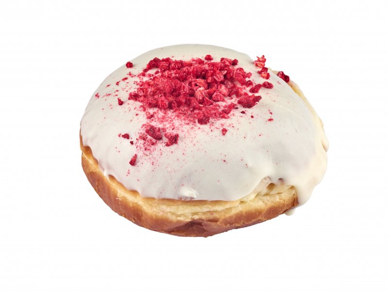 Pączek wypełniony podwójnym nadzieniem: malinami oraz delikatnym kremem, udekorowany białą polewą oraz liofilizowaną maliną.