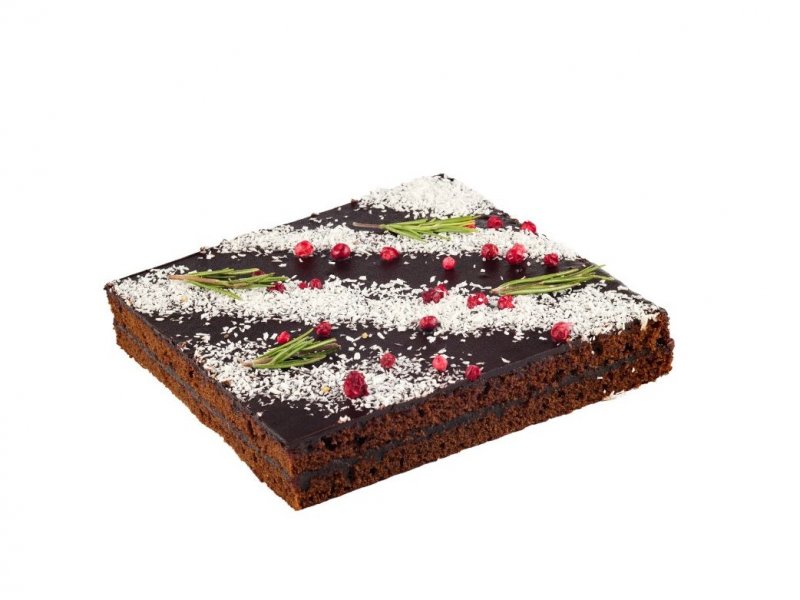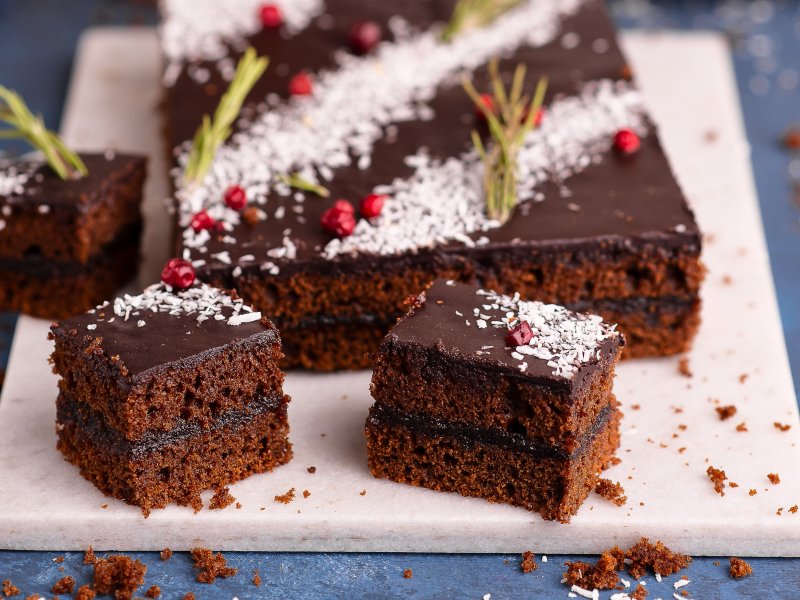 Piernik przełożony powidłami śliwkowymi, oblany polewą czekoladową.