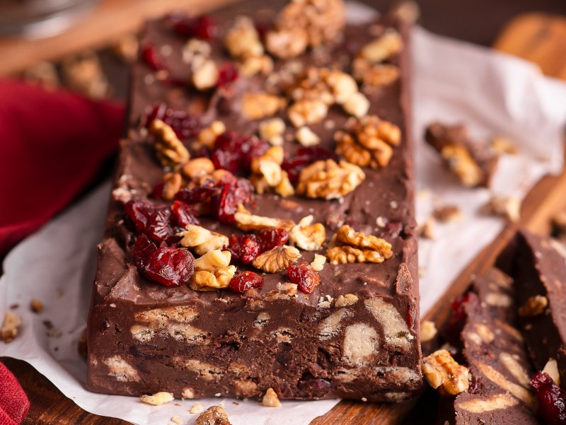 Intensywnie czekoladowy klasyk z ciasteczkami i żurawiną udekorowany bakaliami.