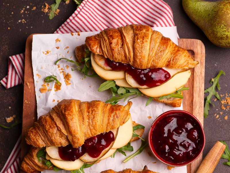 Rogalik Francuski z serem wędzonym gołka, sosem żurawinowym, grilowaną gruszką oraz rukolą.