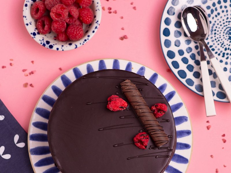 Czekoladowe biszkopty przełożone musem czekoladowym oraz masą migdałowo-orzechową z prażynkami, oblany czekoladą.