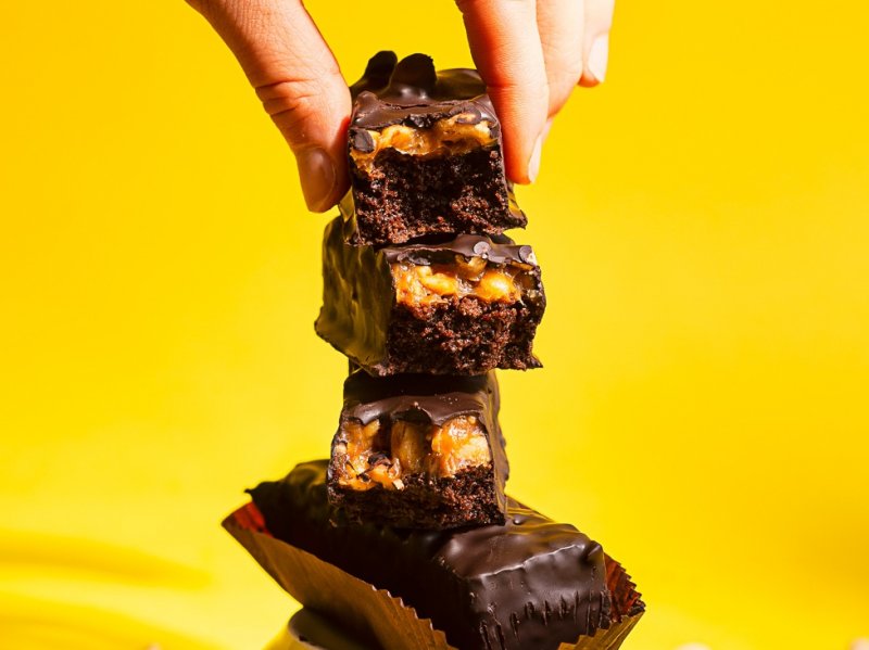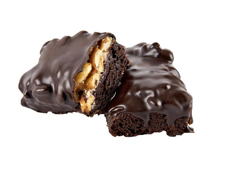 Baton brownie, z orzechami arachidowymi w karmelu, polany czekoladą.