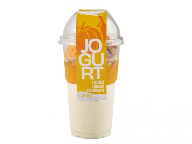 Jogurt naturalny z musem dyniowo-bananowym, dodatkiem musli, mandarynek oraz orzechów i naturalnego miodu.