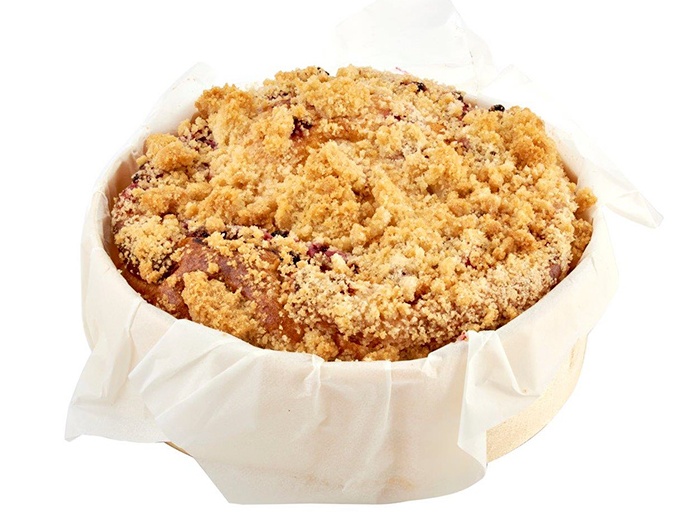 Delikatne ciasto z twarogiem i czerwonymi porzeczkami, posypane kruszonką.