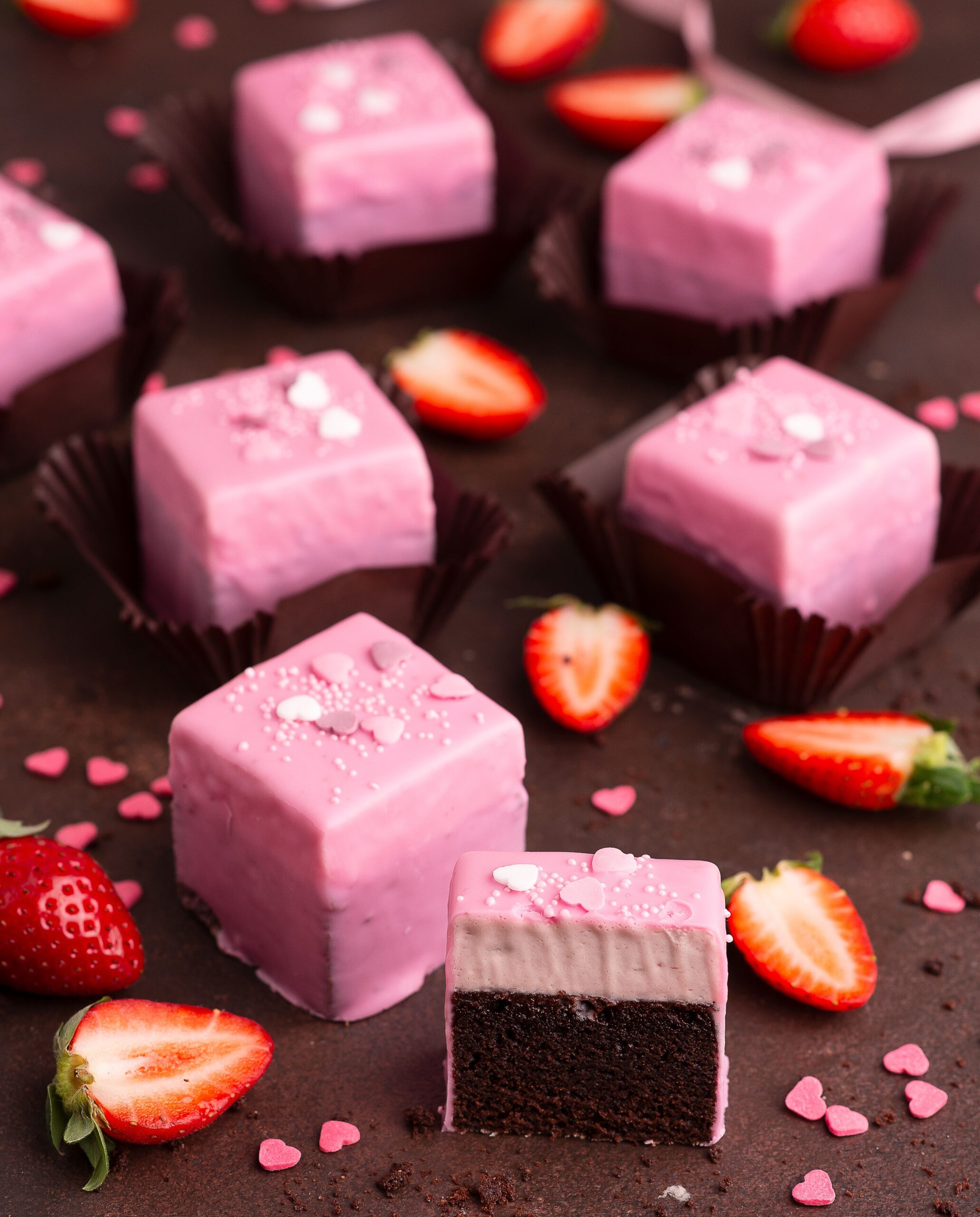 Kostka Brownie z warstwą truskawkową i aksamitnym kremem truskawkowym oblane różową polewą z dekoracją.