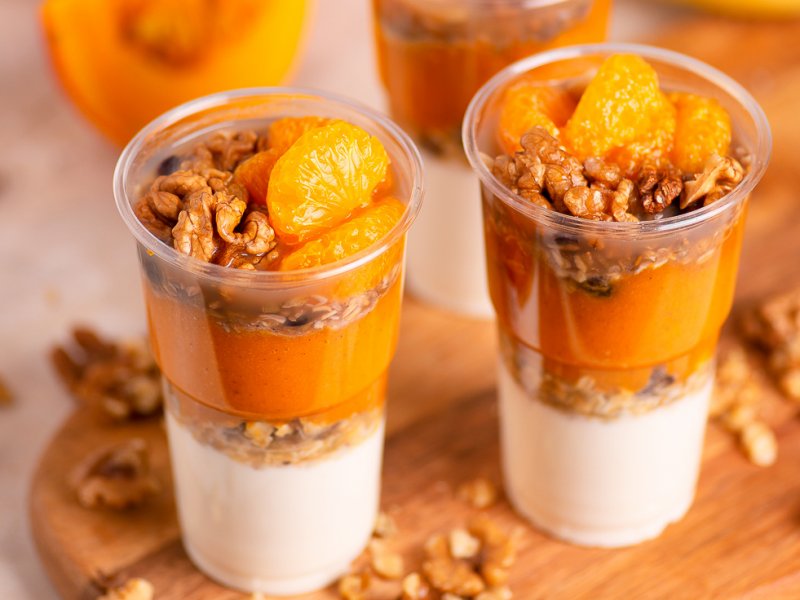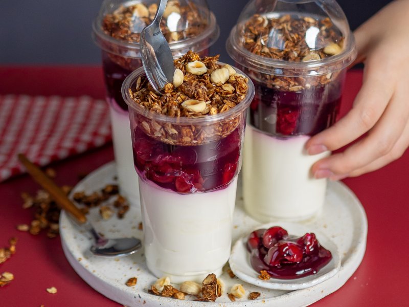 Jogurty naturalne zawierają łatwo przyswajalne białko, wapń, a także witaminy z grupy B i bakterie kwasu mlekowego, które korzystnie wpływają na procesy trawienia. Jogurty warto więc włączyć do diety ze względu na właściwości prozdrowotne, nie zapominając o walorach smakowych. Wielbicielom chrupiącej granoli polecamy Jogurt z Wiśniami, dla osób poszukujących niecodziennych smaków przygotowaliśmy Jogurt z Musem Dyniowo-Bananowym. W naszej ofercie nie zabrakło również tradycyjnej kompozycji Jogurtu Naturalnego z Owocami.