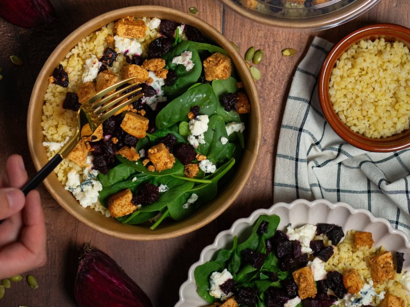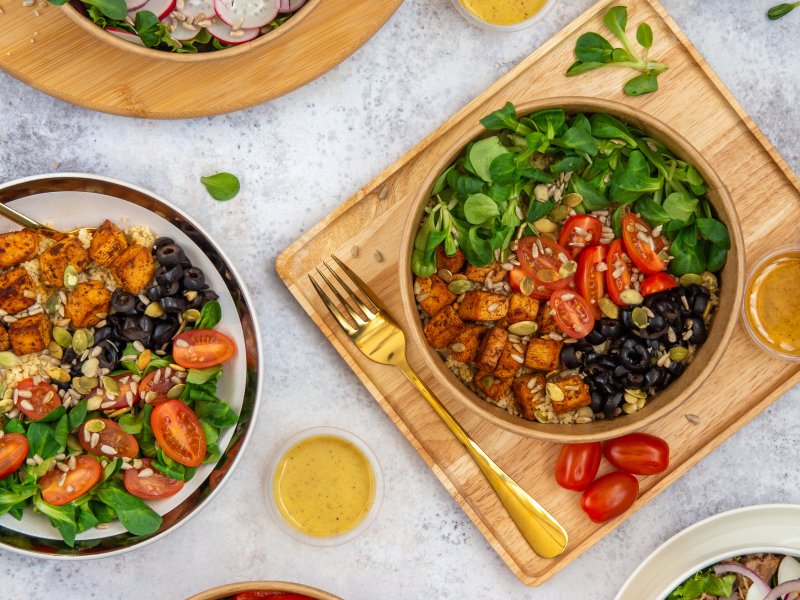Nasze sałatki są przygotowywane ze świeżych, starannie dobranych warzyw. W sezonie jesiennym proponujemy Sałatkę 4 Pory Roku z pęczakiem oraz z pieczoną dynią lub pieczonym burakiem. Wyśmienitym uzupełnieniem codziennej diety będzie też kolorowa Sałatka z Kurczakiem bądź wyjątkowa Sałatka z Łososiem i jajkiem w towarzystwie makaronu orzo oraz zielonych warzyw.
