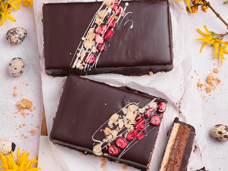 Dekoracyjny mazurek z ciasta biszkoptowego z kremem czekoladowym.