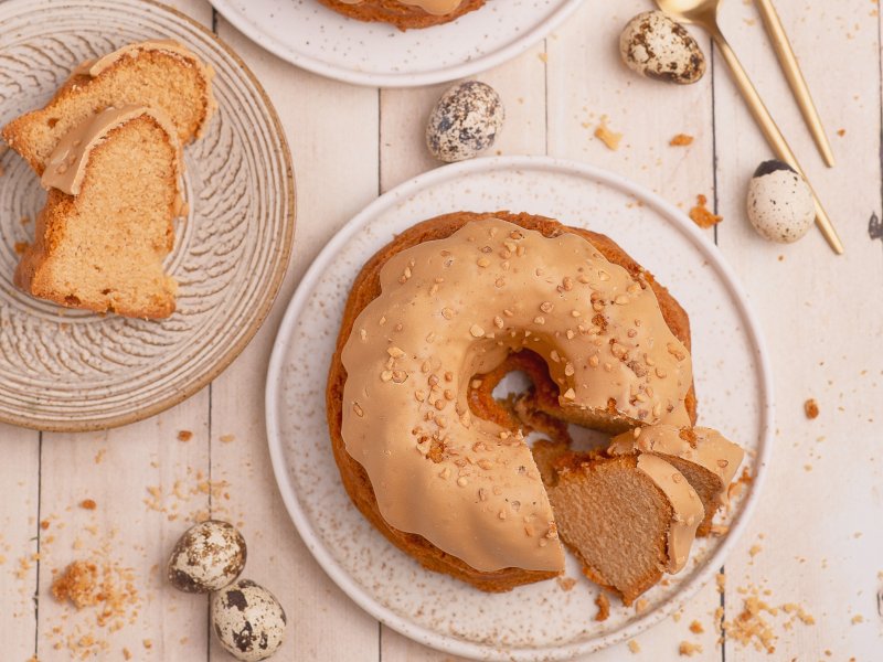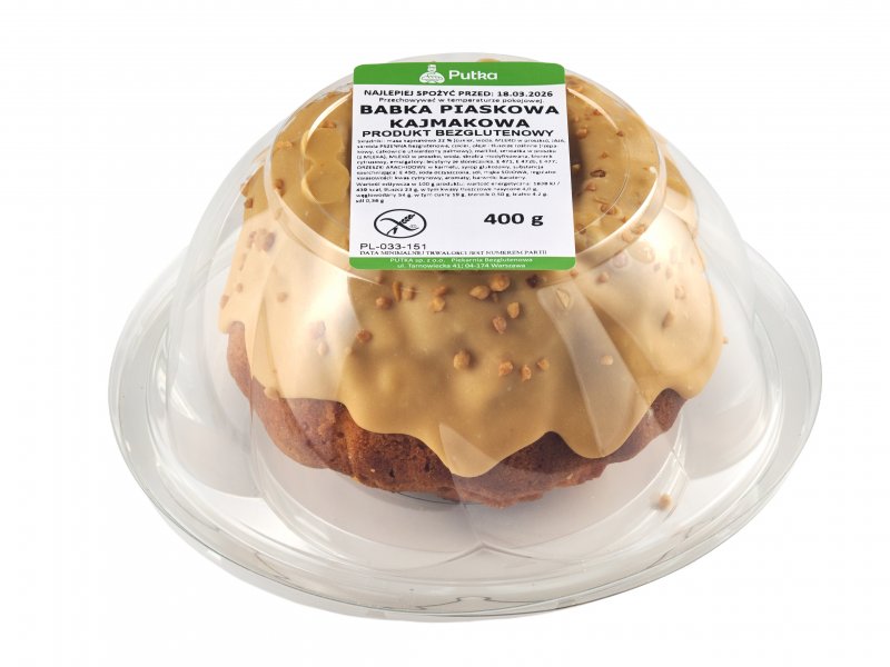 Babka piaskowa z dodatkiem kajmaku, oblana polewą, posypana orzeszkami arachidowymi.