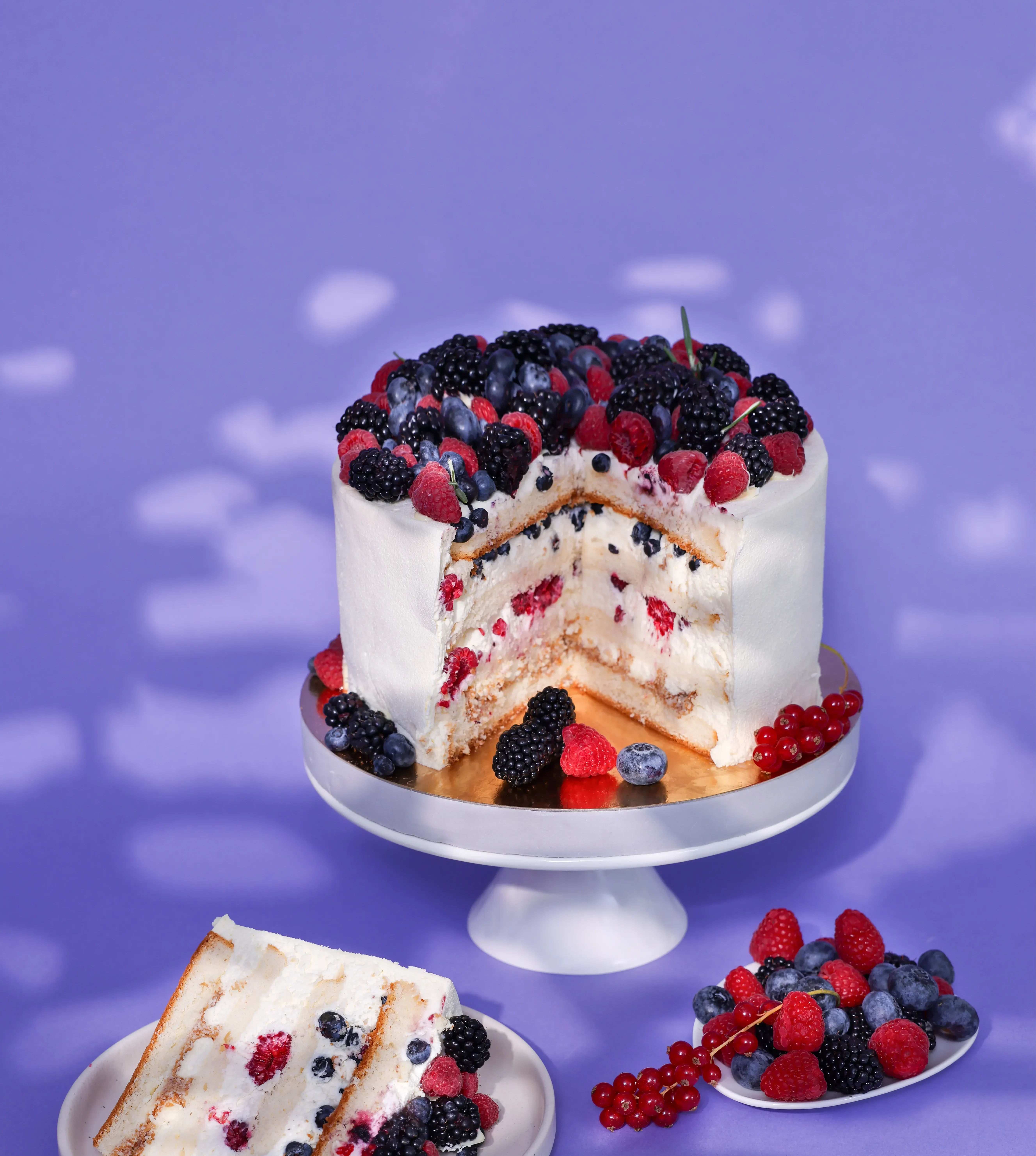 Krem na bazie mleczka kokosowego i soczyste maliny na puszystym biszkopcie. Lekki i pyszny — bez kropli mleka.