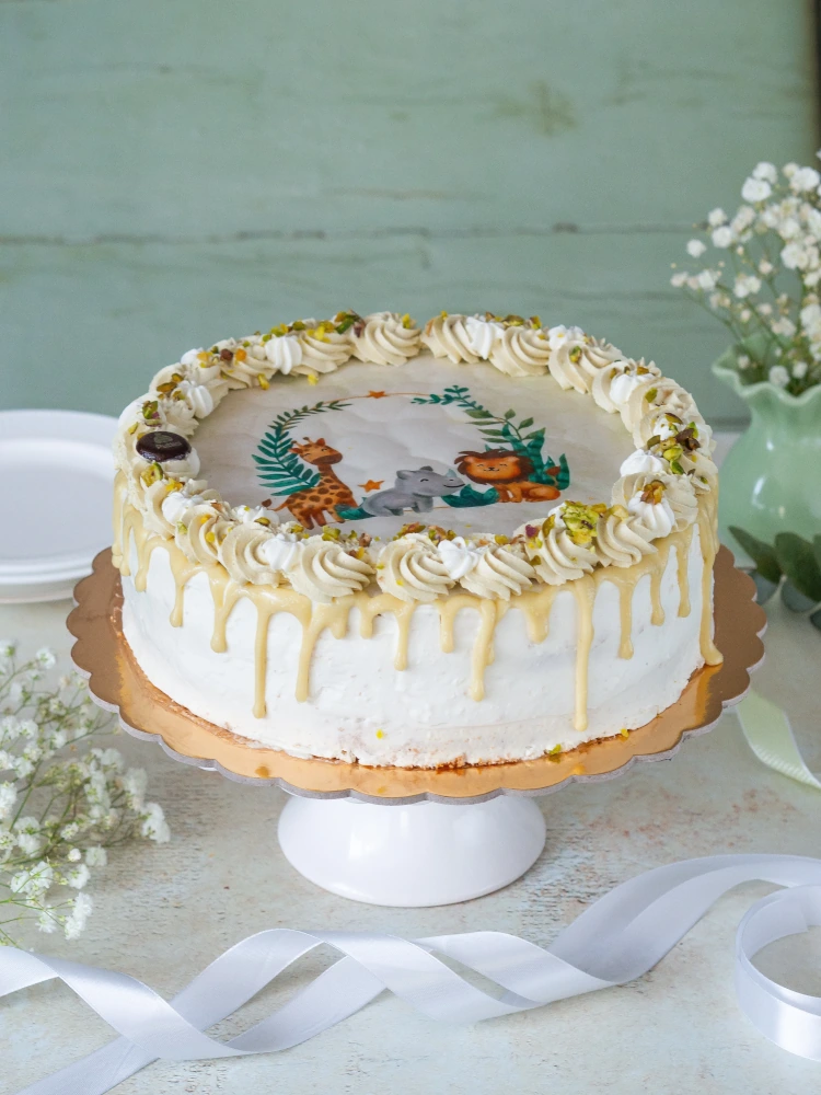 Tort biszkoptowy bezglutenowy przełożony warstwą kremu pistacjowego i nadzienia malinowego, udekorowany pistacjami.